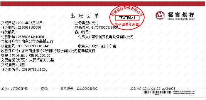 災(zāi)難面前,全國上下風(fēng)雨同行,同舟共濟(jì)。7月22日,潤邦公司決定盡我們的綿薄之力馳援河南,通過鄭州市紅十字會捐款人民幣兩萬元整,用于保障受災(zāi)地區(qū)人民群眾的生命安全、緊急救災(zāi)物資采購等,助力鄭州市防汛救災(zāi)工作。